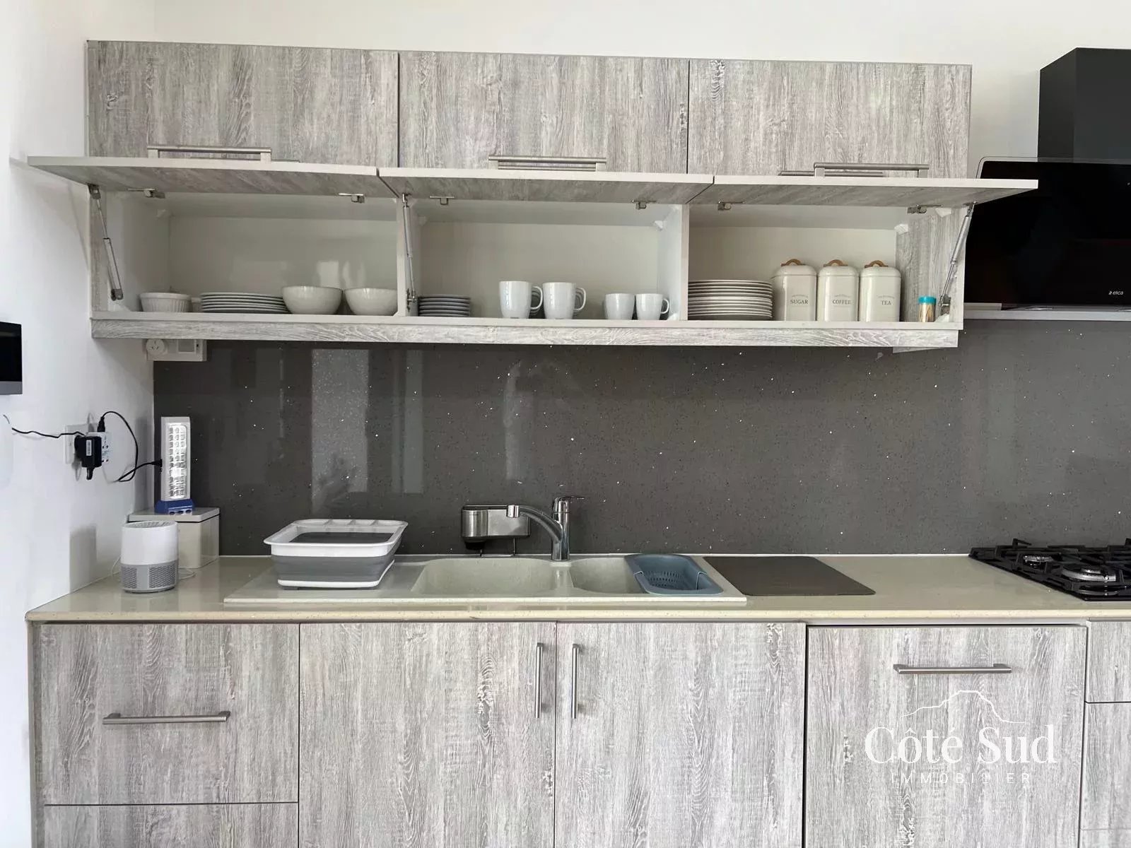 * Cuisine Moderne : Cuisine entièrement équipée et ultra-moderne avec des armoires en bois-grain gris élégantes et des appareils intégrés.