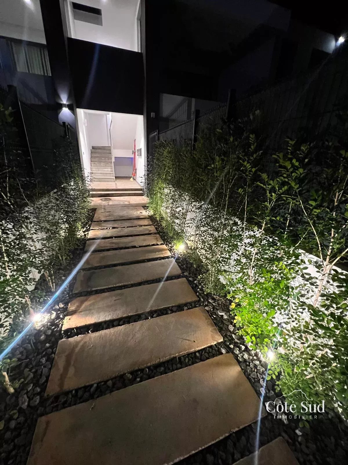 * Entrée Charmante : Un chemin d’entrée accueillant et bien éclairé la nuit, bordé de verdure luxuriante et de luminaires de chemin.